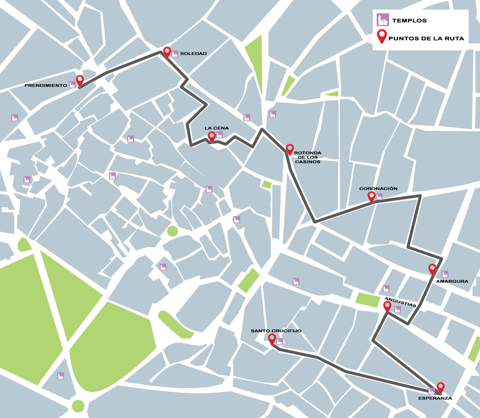 Esta ruta recorre las principales calles del casco histórico de Jerez de la Frontera. Comenzando en la Iglesia de Santiago y terminando en la Iglesia de San Miguel; dos enclaves de nuestra ciudad, pasando por algunos de los templos más importantes del centro. Una ruta que te llevará por los rincones más antiguos e históricos de la ciudad y te hará conocer la vida del autor de este pregón: José Vegazo Mures, a través de la Semana Santa. Para realizar esta ruta, se han seleccionado los poemas más llamativos, visitando las sedes de las Hermandades que el propio autor destaca, de esta forma se hace posible el recorrido en una hora y media.